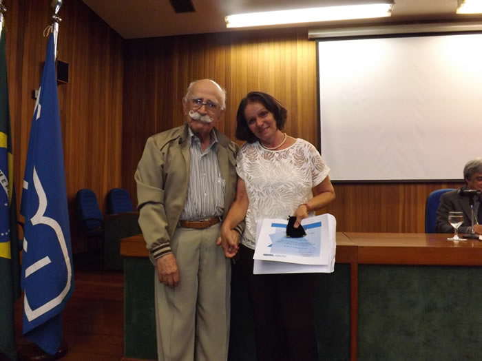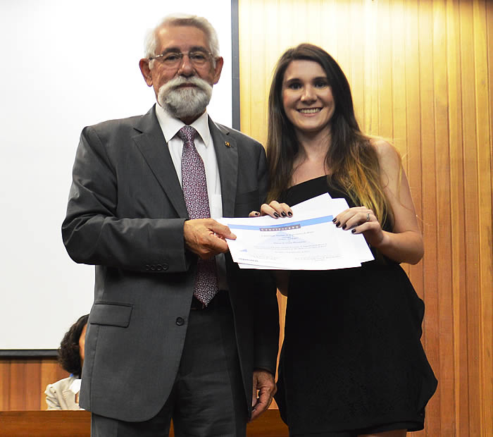 O professor Lineu A. Ayres da Silva entrega o prêmio à aluna Flávia de Lima Fernandes em 14 de dezembro de 2017